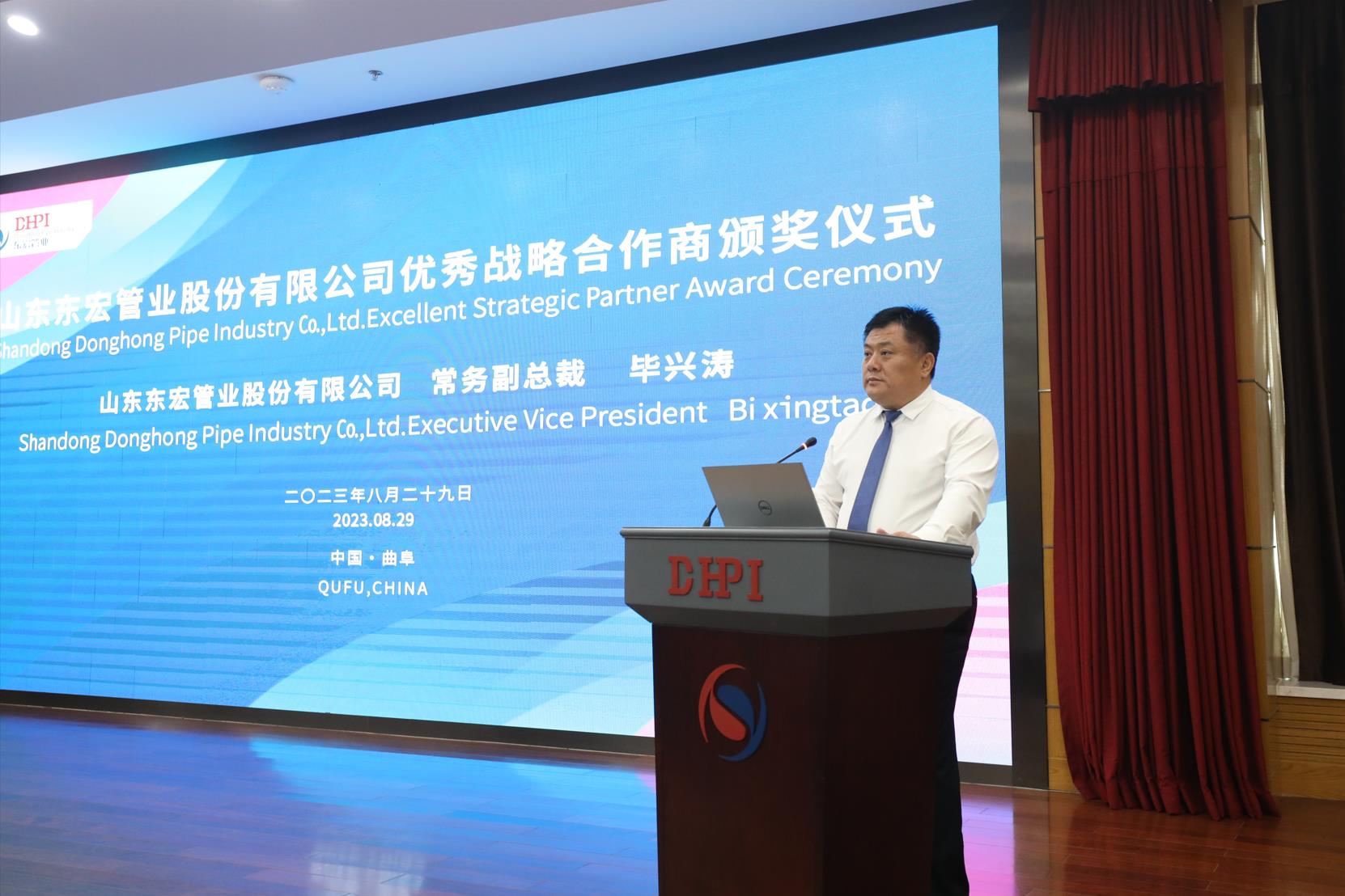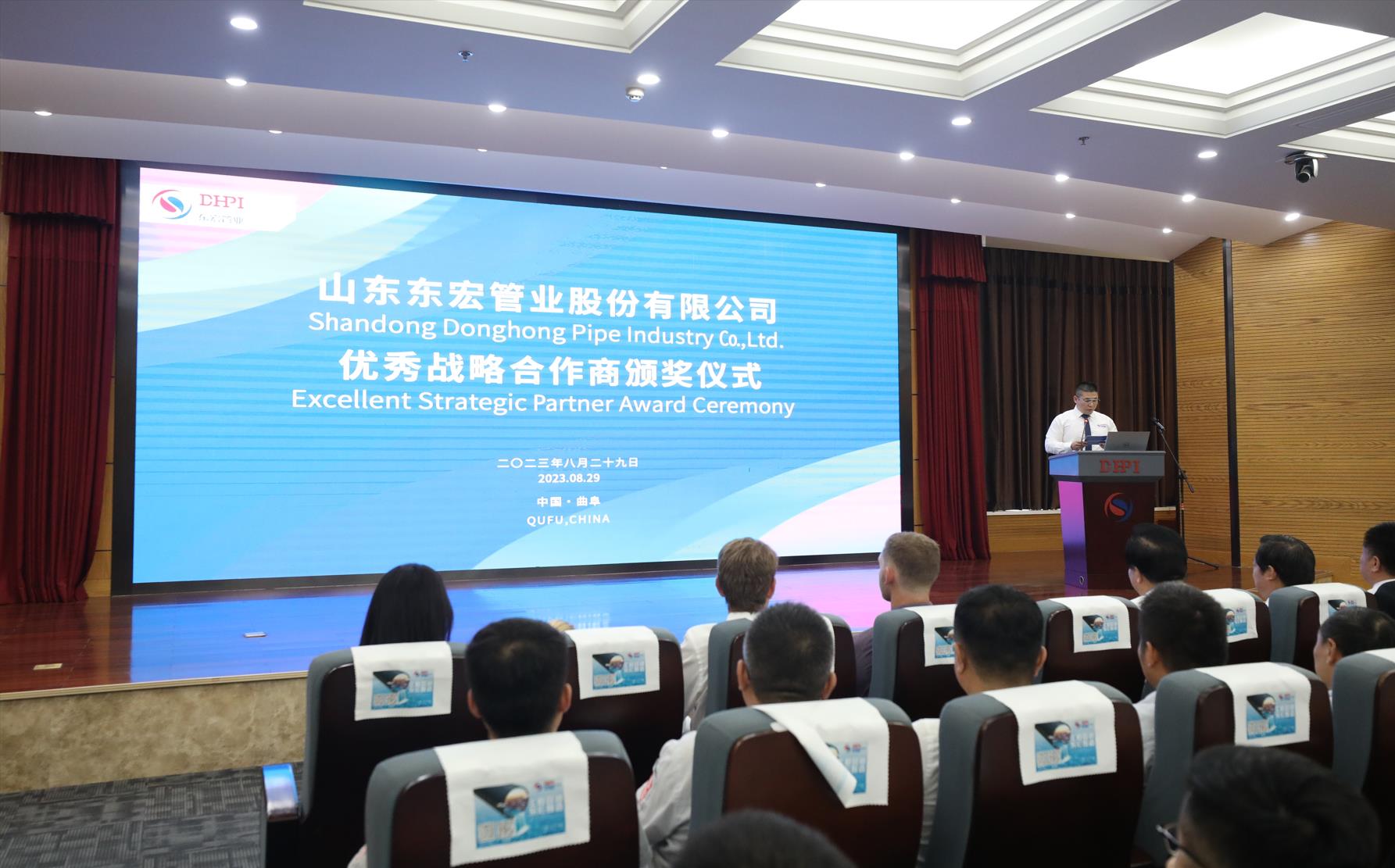 2023年8月29日,东宏股份优秀战略合作商颁奖仪式在研发中心多功能会议厅隆重举行。澳大利亚BACKFILL PIPELINE SOLUTIONS PTY CO.,LTD. 总经理Richard,合伙人Mat Revell、营销总经理贾秋利;公司董事长倪立营、经营管理层以及营销、职能部门人员参加仪式,监事会主席、办公室主任马伯群主持仪式。